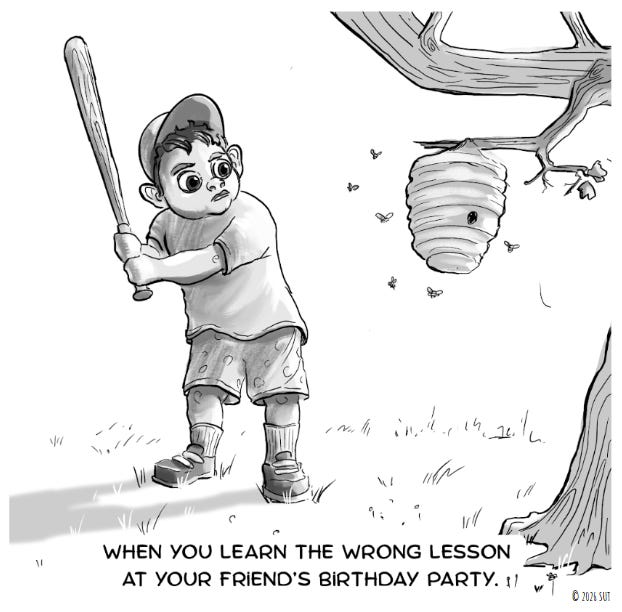 Here’s the link to the naked text description (no AI) that gave rise to this comic (also no AI):